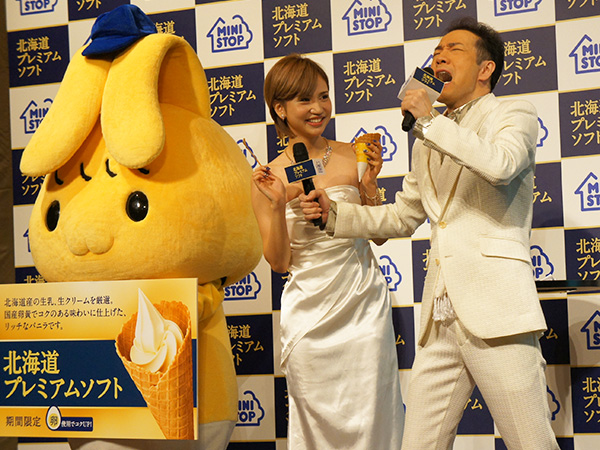 7日に行われたミニストップ『北海道プレミアムソフト』記者発表会では、水沢アリー、田原俊彦が登場し、2人ともテンション高めに「プレミア〜ム」と今回の北海道プレミアムソフトを絶賛。水沢は「とっても濃厚で北海道の味がする〜」と感想を残した。