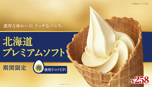 「北海道プレミアムソフト」は、生乳や生クリームなどの乳原料を全て北海道産のものを使用。さらに卵黄を加えることで、濃厚な味わいを引き出している。ミルク感をいかしながらも、バニラ感と濃厚さを全面に打ち出した味わいが特徴。