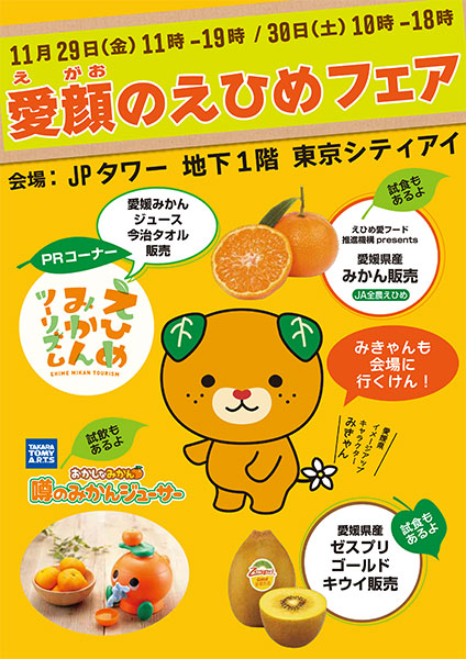 愛媛の農産物・県産品や観光の魅力を発信するPRイベント「愛顔(えがお)のえひめフェア」が、2013年11月29日(金)、30日(土)の2日間、東京シティアイ イベントスペース(JPタワー地下1F)で開催される。