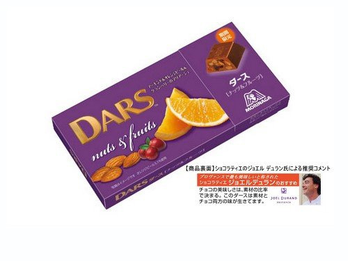 この「ダース<ナッツ&フルーツ>」にはクラッシュしたアーモンドとオレンジピール、ドライクランベリーの3種の素材が贅沢に練りこまれていて、いつもの「ダース」よりワンランク上の品質が楽しめる。そして、フランスの天才ショコラティエのジョエルデュラン氏が「素材とチョコ両方の味が生きている」と推奨コメントを寄せた。(商品裏面にジョエルデュラン氏のコメントを記載。)
