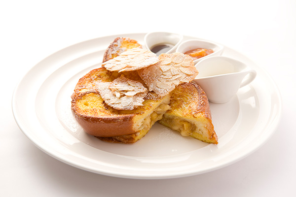 スタッフドフレンチトースト キャラメライズドバナナとパイナップル、アーモンドクリスプ添え