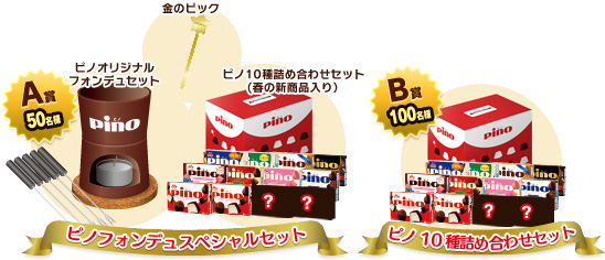 ※A賞の賞品のうち「オリジナルフォンデュセット」「金のピック」は、2014年4月13日(日)に、東京ソラマチ®5Fスペース634で実施予定のイベント「ピノ フォンデュカフェ」にてお渡しとなりますので、当日ご来場いただける方のみご応募下さい。