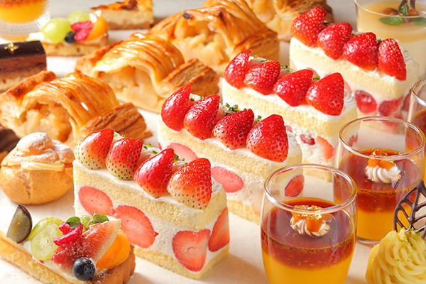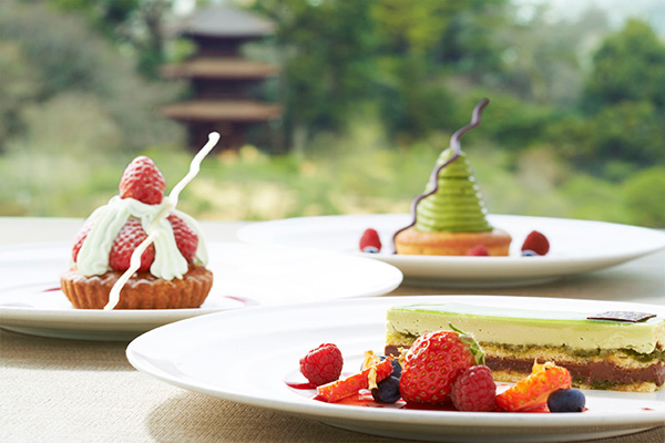 提供されるスイーツは、パティスリーレザネフォール(恵比寿)やパティスリー&カフェ デリーモ(赤坂)等の都内人気店のスイーツと、ホテルパティシエが作る贅沢なスイーツ、そしてホテルらしい演出で目の前で仕上げるデセールなどで、約20種類のスイーツから選ぶことができる。