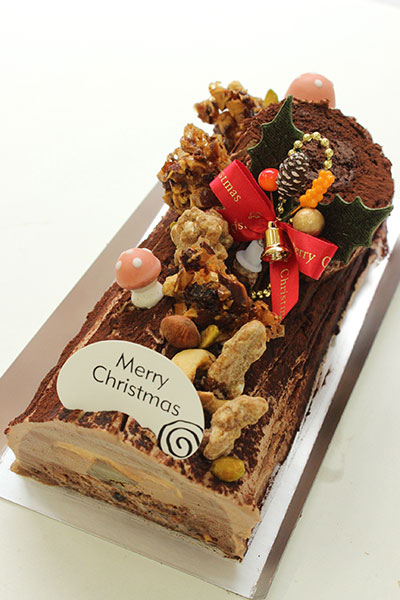 2種類のショコラを合わせた、口どけの良いムースに、オレンジプラリネを合わせたブッシュ・ド・ノエル。